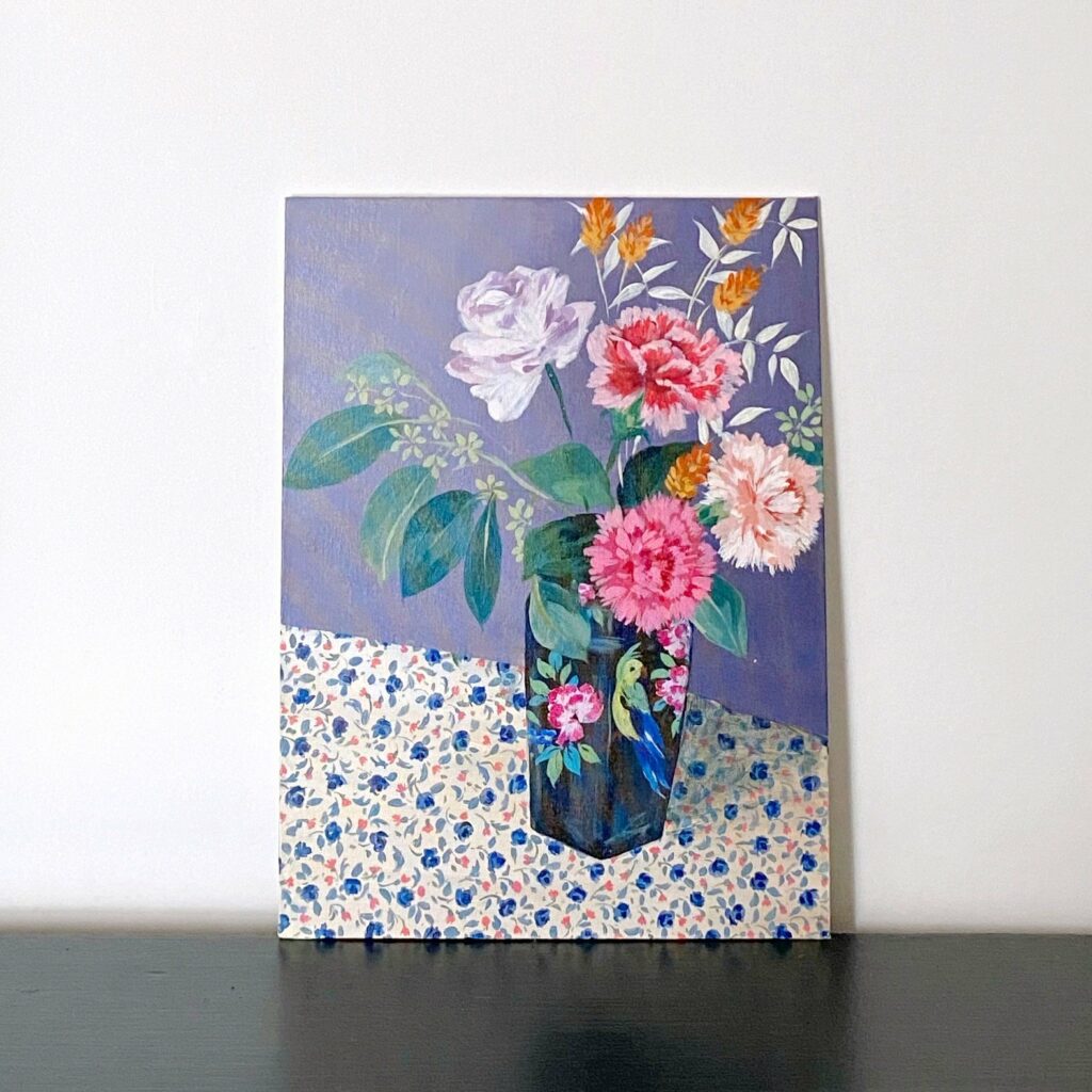 #046 Floral still life on board. Chrysanthemums in black vase.