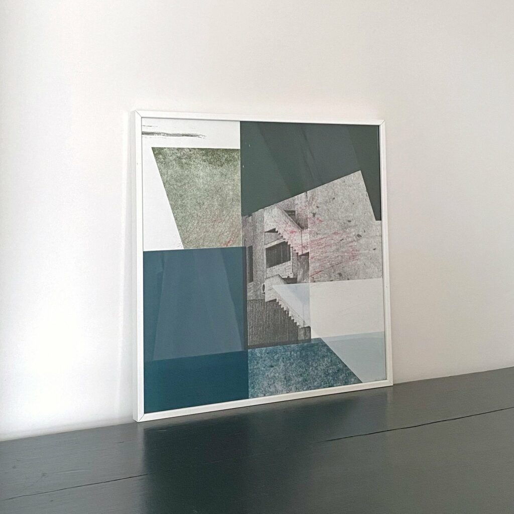 Blue and grey graphic print. Set of 3. Size: 40 x 40cm inc frame