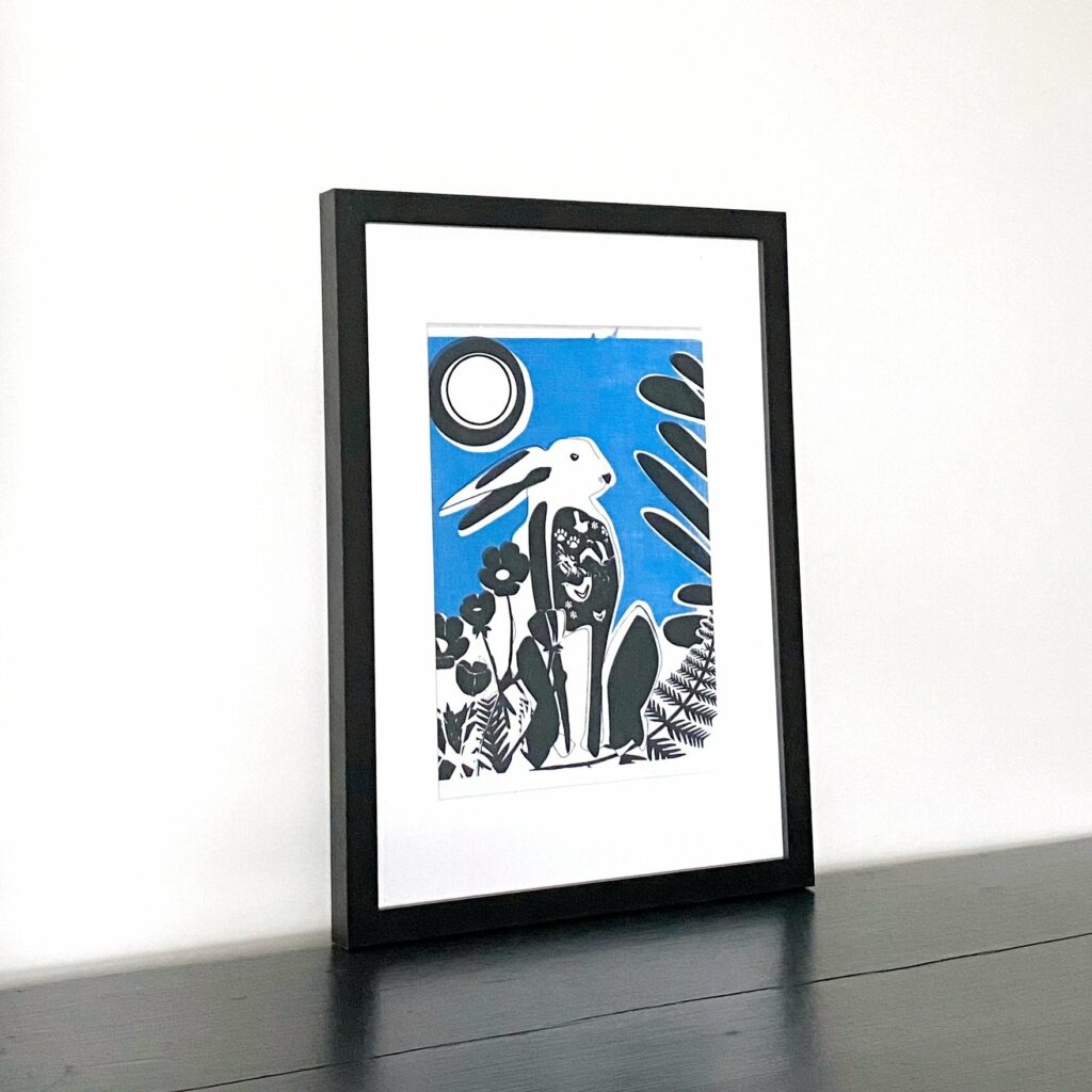 Screen print of rabbit in blue and black. Set of 8 33 x 45cm inc frame
