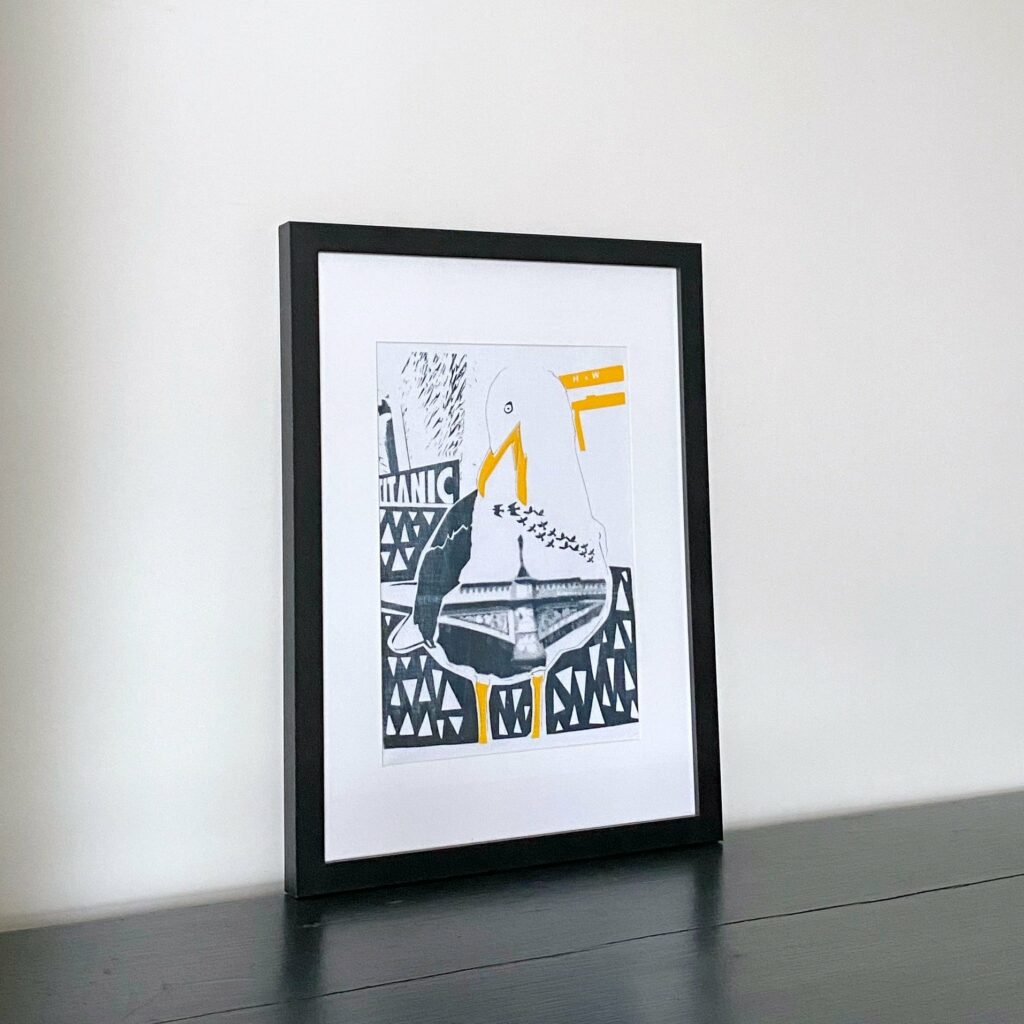 Screen print of seagull in black and yellow. Set of 8 Size: 33 x 45cm inc frame