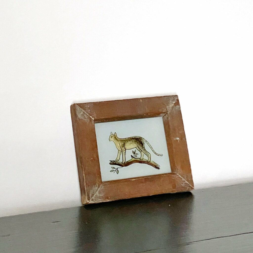 Indian reverse glass painting of a cat, 1 of a set of 9. Size: 14 x 11cm inc frame
