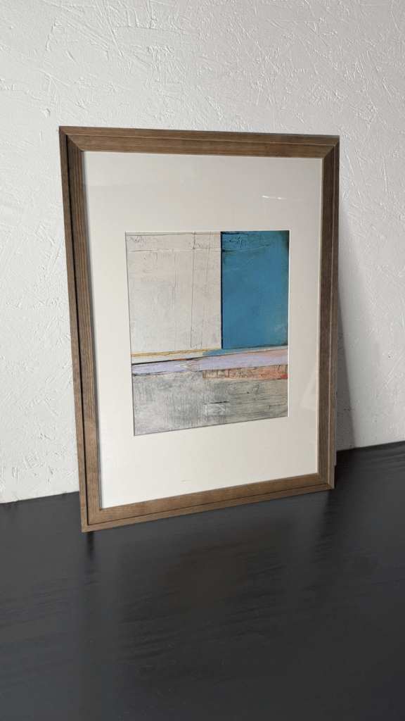 Textured abstract print with blue tones, 1 of a set of 3. Size: 53 x 73cm inc frame