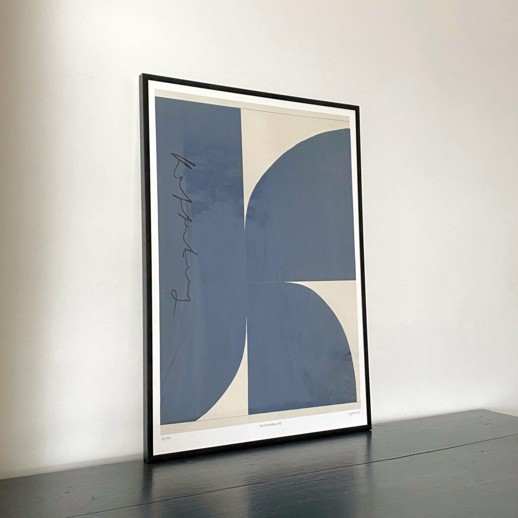 Modern abstract print of blue and black forms, set of 3. Size: 43 x 60cm inc frame.