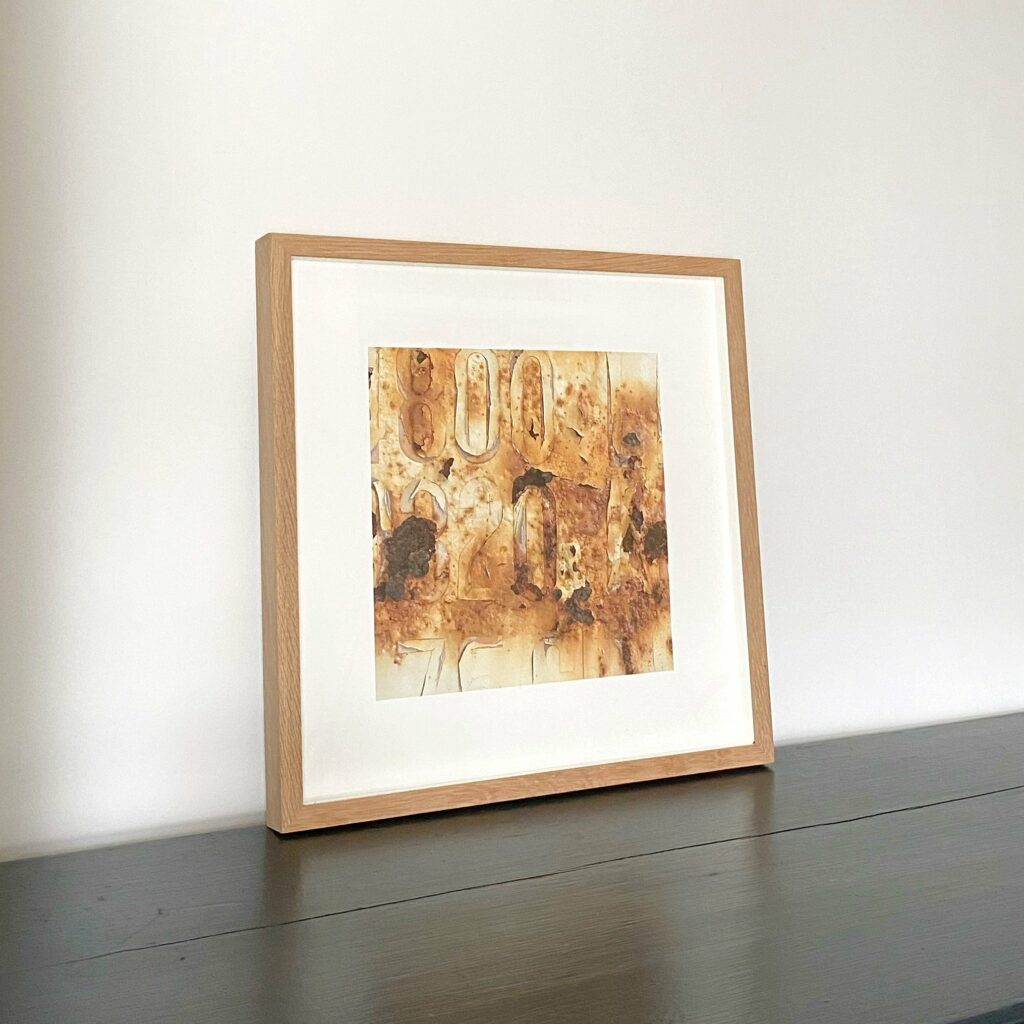 Photograph of white rusted pain on metal, set of 5. Size: 40 x 40cm inc frame.