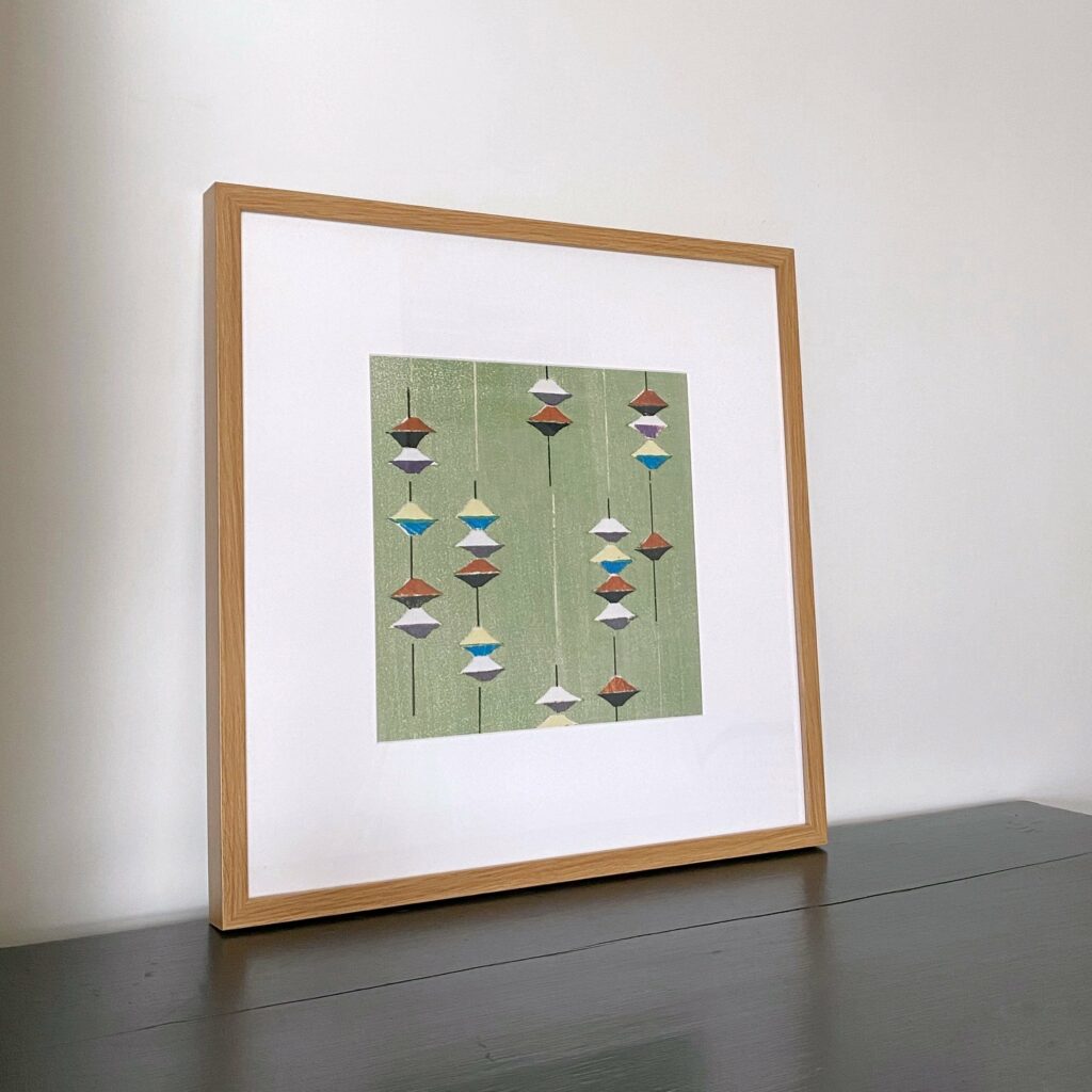 Abstract print of shapes against green background, set of 5. Size: 53 x 53cm inc frame.